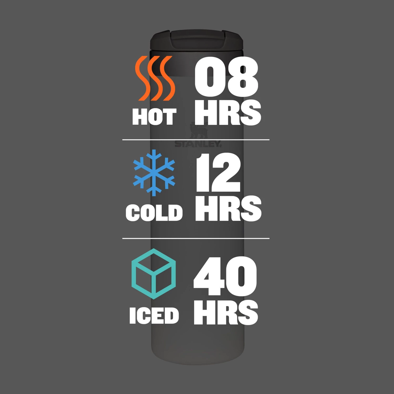 - Keeps drinks hot for 8 hours, cold for 12 hours, and iced for 40 hours