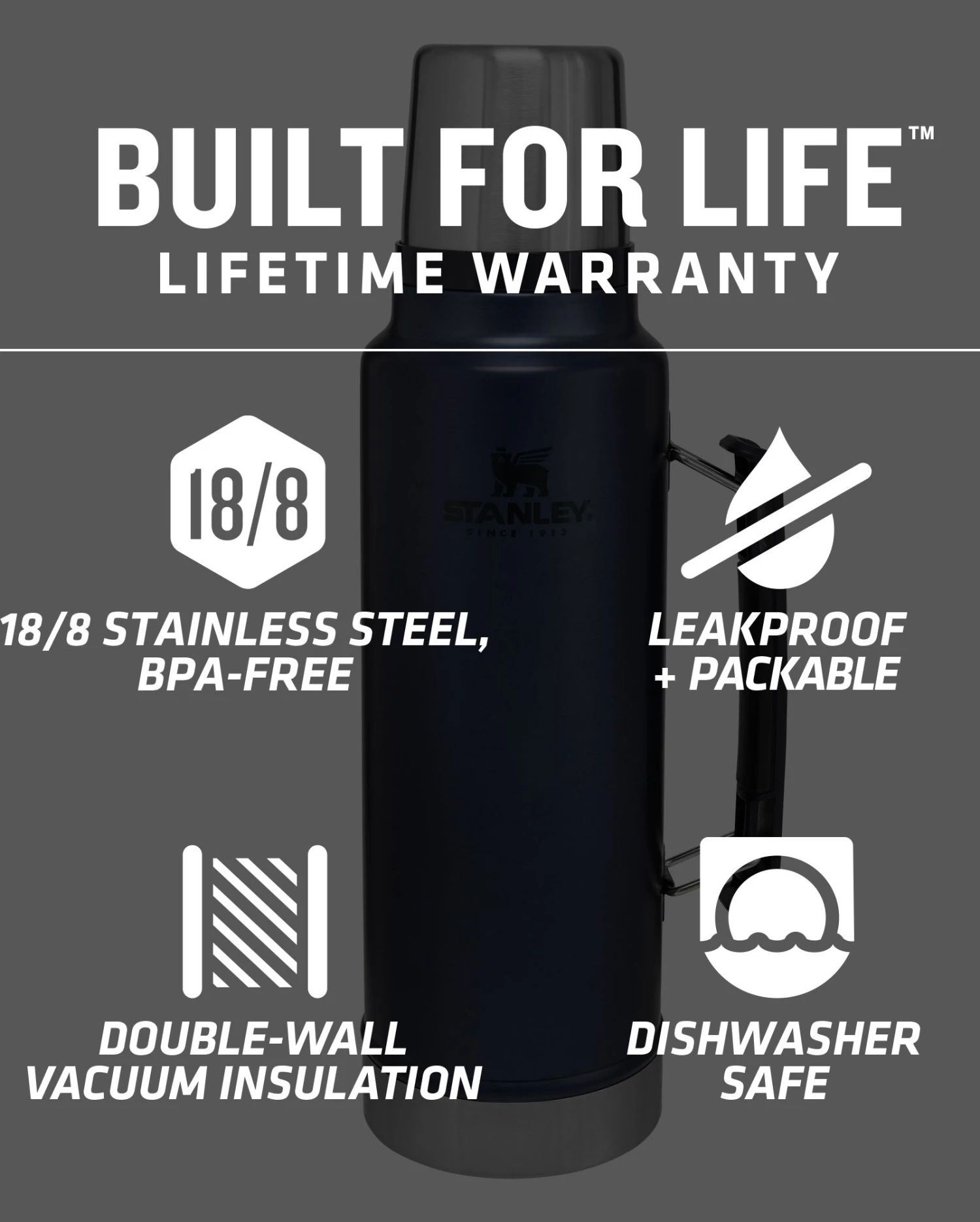 The Stanley® Classic Ultra Vacuum 1.5 qt Bottle is tough enough to endure wear and tear and large enough to fill to the brim with your favorite beverage. The double-wall insulation is ideal for keeping liquids hot all day. This bottle is constructed with a hefty handle and easy pour stopper to negate accidents and is leak proof. Stay on the go with the Stanley Classic Ultra Vacuum 1.5 qt Bottle and keep your beverages hot all day.